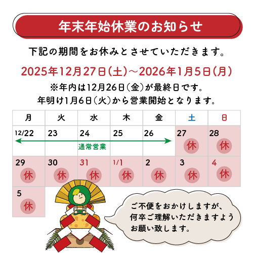 年末年始 お休みのお知らせ 2025.12.05 新着情報 重要なお知らせ 株式会社カボス、年末年始のお知らせです。下記の期間をお休みとさせていただきます。 2025年12月27日(土)~2026年1月5日(月) ご依頼のある方はお早めにお願いいたします。
